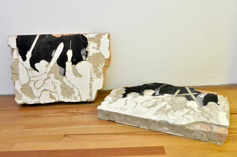 Segundo lugar: Andrés Vergara / 9 de abril o el fin del tiempo o el tiempo del fin / Impresión Giclée y grabado sobre escombro