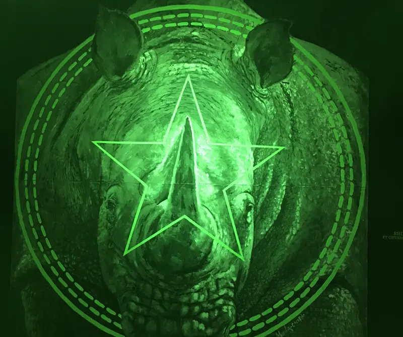 Cifuentes decidió dibujar un rinoceronte mientras que Cacerolo optó por pintar un retrato de Chuck Taylor, un basquetbolista estadounidense de los años cincuenta que se convirtió en símbolo de la marca. Ambos fueron pintados en color verde neón. “Nos pidieron pintar dos telas y aunque el trabajo es colectivo buscamos hacer obras que nos identificaran a los dos. Cacerolo decidió pintar al creador de los Converse y yo a un rinoceronte, que es un animal que he pintado obsesivamente”, explica Cifuentes.