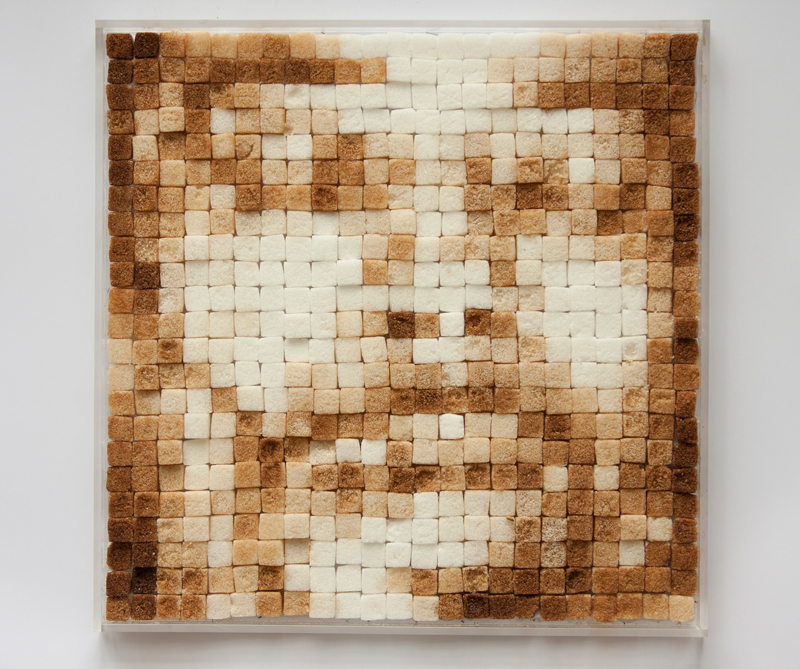 Al lado opuesto, a lo largo de la pared, cuelga otro archivo del artista. Entre 2012 y 2013 recolectó papeles con perforaciones rectangulares y los enmarcó. La obra titula 2×3 porque esos son los centímetros que miden las fotos de las cédulas y que aquí son huecos en el papel. En la exposición vemos un camino de marcos blancos, cada uno con identidades desaparecidas. Los bordes alrededor de los vacíos develan que alguien, por ejemplo, usó corbata o se vistió de rojo. Que tenía el pelo negro. Que el fondo, ese día, era de color azul.
