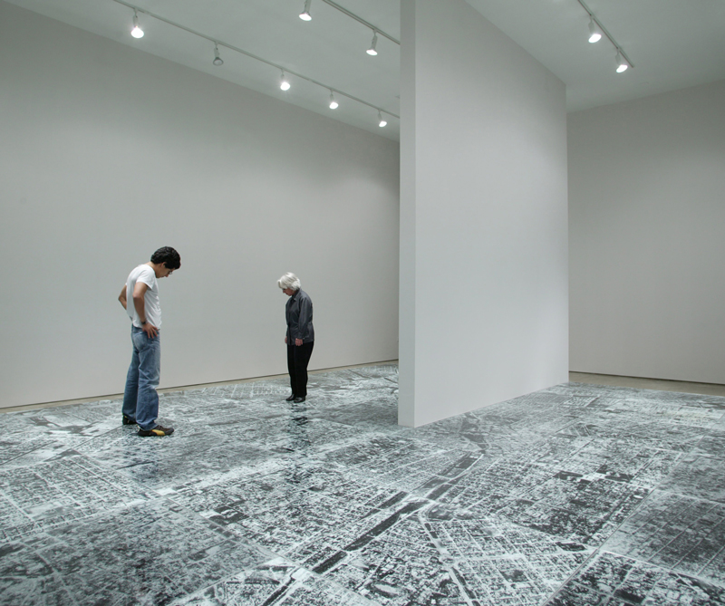 Sobre el suelo, atrás de los Narcisos, y ocupando una gran área de la exhibición, está Ambulatorio, un mapa aéreo de Cali encapsulado en un vidrio de seguridad. Quien camine por encima craquela la ciudad con su peso, activa la obra y a la vez la destruye.