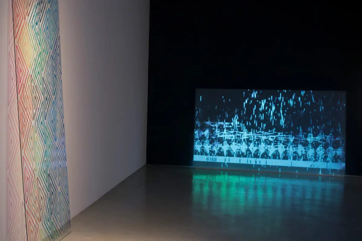 La dos pantallas que muestran la animación –en las que el video se usa más como material y textura que como un medio narrativo– están complementadas por cuatro vidrios con dibujos geométricos de colores brillantes que recuerdan aquellas composiciones de color de Josef Albers y que están inspiradas en las pinturas de Sonia Delaunay.