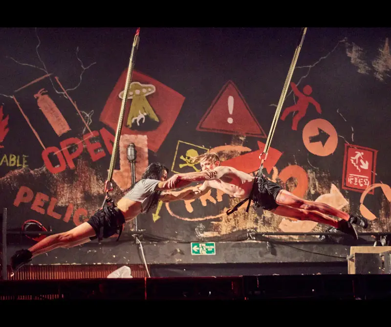 Es una catarsis, tanto para los actores principales de la obra –Juan Carlos Gallego y Javiera Valenzuela- como para el público. La premisa de esta dramaturgia de Rangel consiste en un apocalipsis de la que escapa la pareja por medio de un hueco que conduce a una fiesta subterránea en la que la gente vuela. Una fiesta ‘queer’ de circo al extremo con especialistas en contorsión, lira, anillas, suspensión capilar, cuerda indiana, trapecio, piso parada de manos y arnés. Ellos son Alina Velásquez, Alberto Córdoba, Julio Yanés, Lorena Briceño y Fabián López. Acróbatas colombianos de un nivel realmente sorprendente que hacen que el público reflexione sobre las posibilidades de su cuerpo.