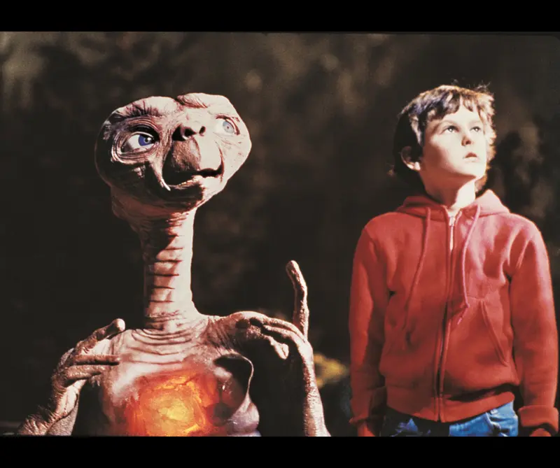 «Yo creo en la inspiración del momento, así como en la crisis de la inspiración», dice Spielberg cuando cuenta cómo se le ocurrió E.T. Pensaba en esos tiempos en una película musical o en hacer la segunda parte de los «Cazadores del arca perdida», le daba vueltas al tema y pensaba en que Indiana Jones podría proseguir el duelo heroico iniciado con un guerrero árabe en los bajos fondos de El Cairo. Le tocó hacer un viaje y cuando el avión despegó, dejándole contemplar una estupenda vista de Hollywood iluminada, él pensó: «Esta misma visión tendría un extraterrestre si se asomase a la Tierra una noche así”. Y empezó a imaginar a E.T. en lo alto de la colina, cuando su nave desapareció y lo dejó solo. Pensó en un ser frágil, que podría sufrir una bronquitis. Que podría venir de otro planeta, pero tan simple y sencillo como cualquiera de nosotros. Cuando el avión aterrizó en Nueva York, ya Spielberg tenía su fantasía en la mente.
