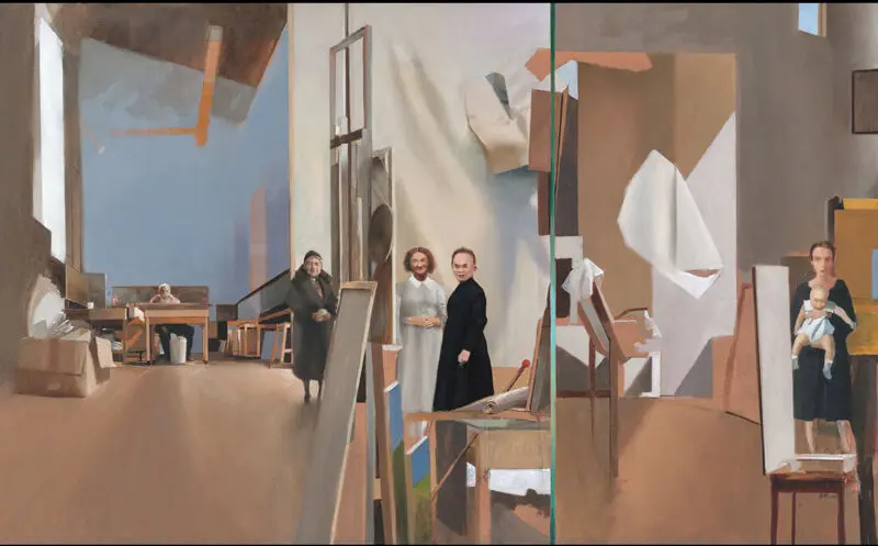 Una de las obras en las que mayor tiempo se detiene este pintor de estatura baja, gafas, saco de lana verde oscuro y una corbata cuyo nudo apenas se entrevé, gira en torno a la Grecia Clásica. Se trata de un óleo de un espacio interior. Del estudio del pintor, para ser más precisos. Las formas abstractas se intercalan aquí y allá con artilugios tan reales como un caballete. Luego se atisban tres mujeres.