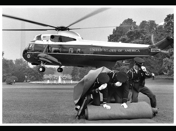 Todos recordamos la foto a blanco y negro, del helicóptero de Richard Nixon a punto de despegar de la Casa Blanca después de renunciar a su mandato en 1974. A pesar de no tener acceso directo al entonces presidente, Leibovitz captura detalles más particulares como dicha escena, en la que tres soldados recogen la alfombra, lo que simboliza el fin de una era.
