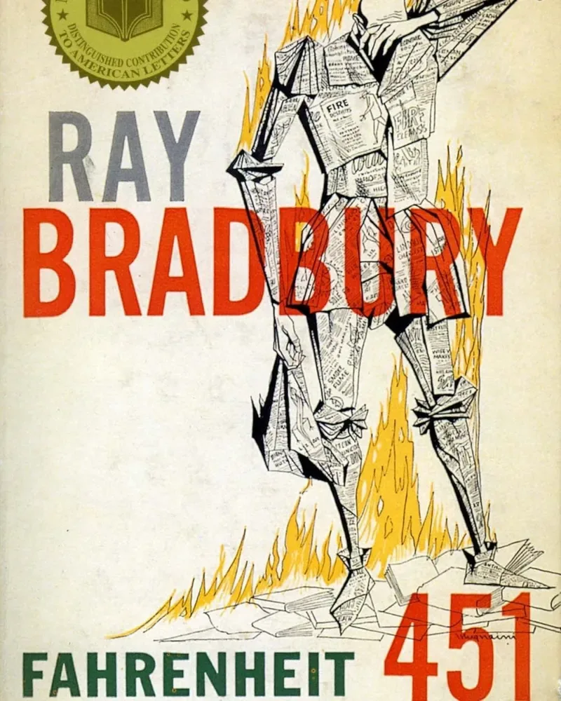 Un lienzo blanco. Un pequeño texto en la esquina superior izquierda contextualiza las obras previas del autor; su nombre, Ray Bradbury, aparece en el centro en gris y naranja translúcido. En la parte inferior, el título cambia el gris por un aguamarina oscuro. En el fondo, un hombre lamentándose, hecho de páginas que se queman lentamente sobre una pila de libros. En un libro sobre una sociedad distópica que quema libros por temor a la educación, el diseñador de la portada Joe Pernaciaro y el ilustrador Joseph Mugnaini no pudieron encontrar una mejor manera de representar el escenario de la historia y el inminente dilema moral del protagonista, Guy Montag. Otra prueba de que una portada bien hecha desde el principio puede ser tan icónica como cualquier diseño posterior con la ventaja del tiempo y de múltiples intentos.