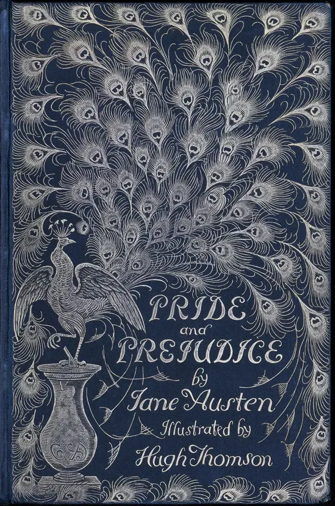 La segunda novela de la escritora inglesa Jane Austen se publicó inicialmente en 1813 con, como era de esperar, una cubierta blanca y el título en letras rojas. Como en cualquier libro popular, existen cientos de portadas: algunas más simples, otras con marcos florales, imágenes realistas o minimalistas. Sin embargo, en 1894, la primera edición completamente ilustrada de Orgullo y prejuicio se destacó notablemente. La ilustración, realizada por el artista irlandés Hugh Thompson para la editorial George Allen, constaba de más de 160 imágenes que rodeaban a los personajes y las escenas clave de la novela. A pesar de esto, la impresionante portada se llevó la mayoría de halagos: colores azul y dorado, con el título en el centro inferior y, como principal atractivo, un pavo real a la izquierda cuyas plumas cubren todo el espacio. En la novela, el pavo real nunca se menciona, ni siquiera como decoración de fondo, lo que convierte su inclusión en algo puramente simbólico y no narrativo. En la página web del Centro Jane Austen se menciona que Thompson pudo haber elegido el ave como “una representación visual de los temas y la atmósfera del libro”, haciendo referencia a la frase inglesa: “proud as a peacock” (“orgulloso como un pavo real”). Desde entonces, es casi imposible disociar el ave de la novela, convirtiéndose en un motivo visual que surgió décadas después de su publicación.