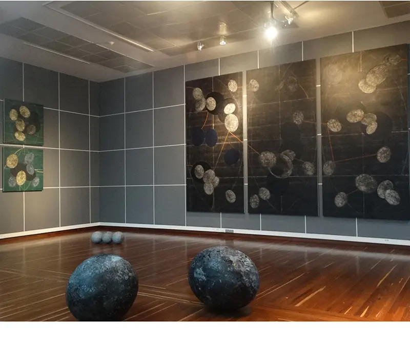 Una de las obras más impactantes visualmente es Gea, un tríptico de 3.82mts de alto por 5.80mts de ancho. En él, los ovoides son azules, negros, grises y algunos están unidos por una línea amarilla. Uno de los espectadores le dijo al artista que parecía una tabla periódica, “fue uno de los vigilantes del Archivo, me pareció grandiosa esa interpretación porque esta muestra trata de eso mismo, del origen”, recuerda Vélez.