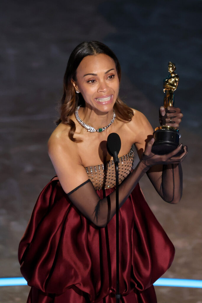 La victoria de Zoe Saldaña como Mejor Actriz de Reparto fue uno de los momentos más esperados de la noche. La estadounidense de ascendencia dominicana recibió el premio con emoción y dedicó unas palabras a su comunidad latina.