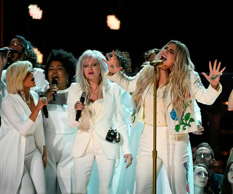 Sin embargo, Kesha se apropió del escenario junto a Camila Cabello, Julia Michael, Cyndi Lauper, Bebe Rexha y Andra Day, quienes vestidas de blanco interpretaron ‘Praying’, una canción sobre los abusos físicos y psicológicos que soportó Kesha por parte de su productor Lukasz Sebastián Gottwald (Dr. Luke).