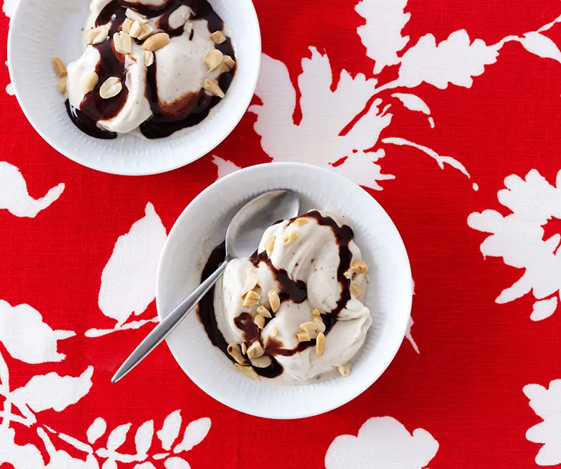 Sirva en un recipiente y cubre con el jarabe de chocolate y el maní.
