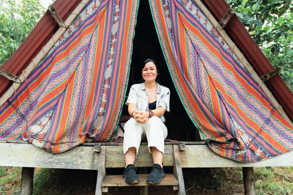 Kindiwayra significa ‘colibrí del viento’ en inga. Le puso así porque la reserva está localizada en un punto geográfico muy especial: recibe los vientos del cañón del río Mocoa, la parte oriental de la cordillera de los Andes y la serranía de los Churumbelos. La vista desde su casa es inmensa y poderosa. Tiene tres cabañas de estilo tipi, cada una con un dibujo que representa alguno de los animales que habitan el ecosistema: una danta, una nutria y un pájaro cuco.