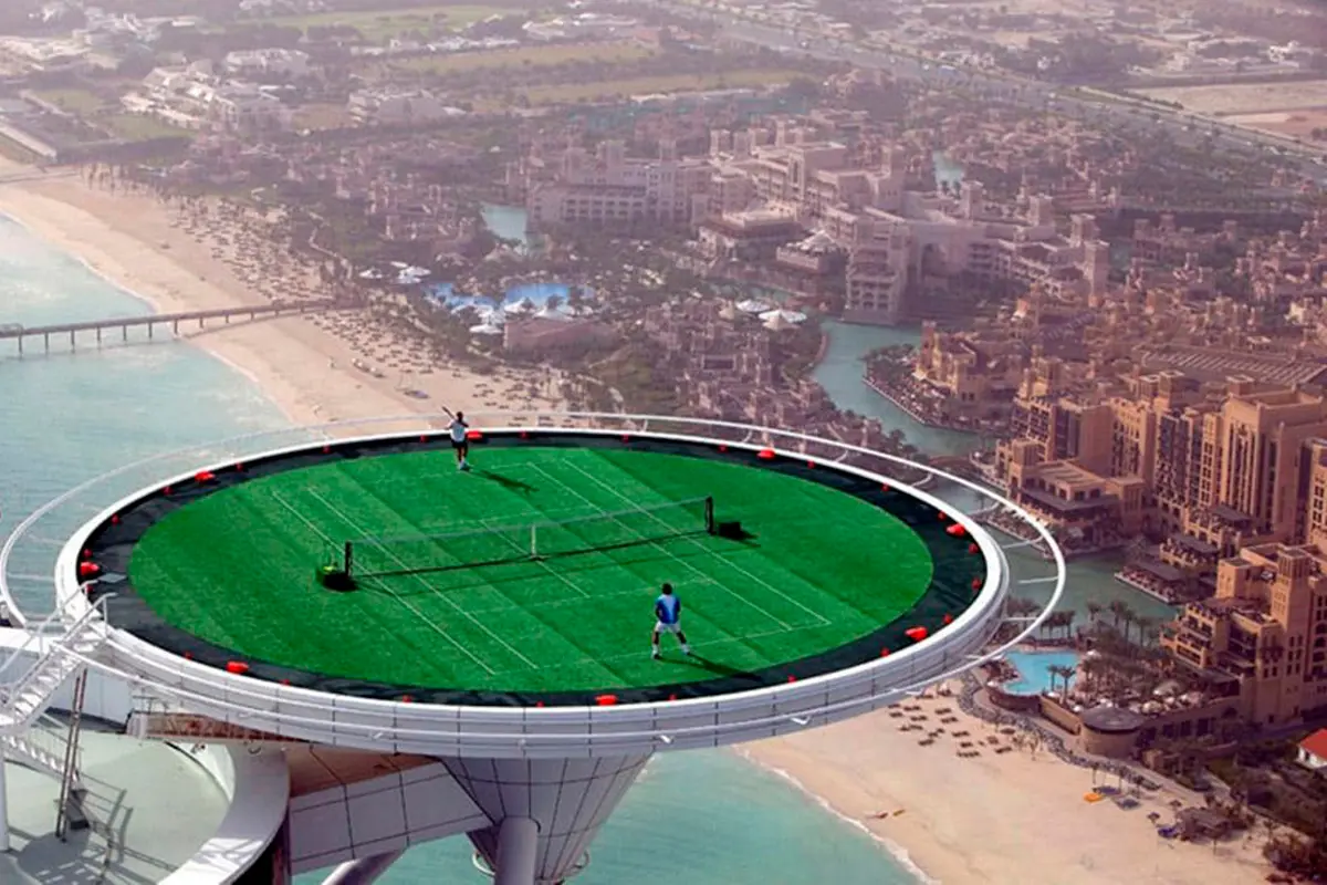 La cancha, Burj Al Arab, tiene una superficie de césped que se habilita para partidos de exhibición como el que se disputó entre Roger Federer, campeón de 88 títulos, y Andre Agassi, campeón de 66 títulos en 2005. La experiencia de jugar a 211 metros altura y disfrutar de los atardeceres de Dubai van más allá de la pasión por el deporte.