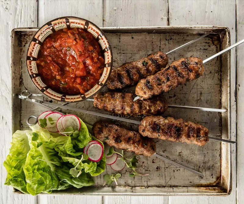 Aparte, caliente una parrilla y úntela con un poco de aceite vegetal. Cuando esté bien caliente, ponga a asar los kebapches, dándoles vuelta para que tomen un color dorado. Sirva con la salsa liutenitsa y una ensalada.