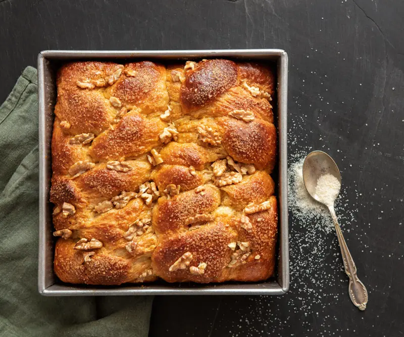 Mientras tanto, precaliente el horno a 220 °C. Quite el trapo del molde, unte con un huevo batido, espolvoree un poco de azúcar encima y decore con una manotada de nuez nogal. Llévelo al horno por unos diez minutos, baje la temperatura a 180 °C y siga horneando por unos veinte minutos más. Retire del horno y deje enfriar en el molde. Disfrute de una vez o durante los próximos dos o tres días. Es perfecto para unas onces o para desayunar con una taza de café.