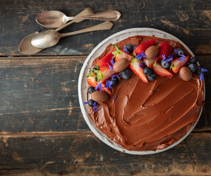 Por último, desmolde las tortas y esparza la cubierta con la ayuda de una espátula. Decore con frutas, huevitos de chocolate y flores comestibles o a su gusto.