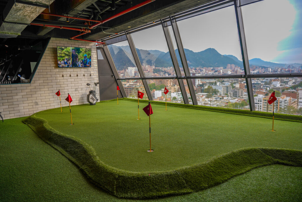 Sky 19 es el nuevo lugar en Bogotá para practicar indoor golf. El espacio cuenta con cuatro simuladores de alta tecnología, un putting green de seis hoyos, un restaurante-bar que ofrece diversas opciones de comida, y una panorámica inigualable de la ciudad, ya que está ubicado en el piso 19 de un edificio en el norte de la capital.