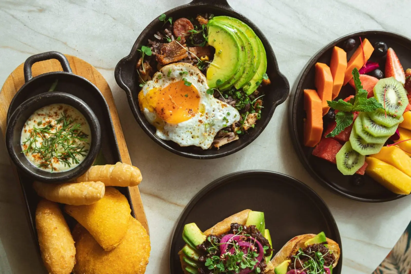 Inicie con un bowl de frutas, y continúe con fritos típicos de la región y unos pancakes de frutos rojos. Luego elija entre unos huevos rancheros en tortillas de maíz morado, sour cream y guacamole, o un calentado paisa, que viene con fríjoles con arroz, chorizo, chicharrón, maduro y huevo frito.