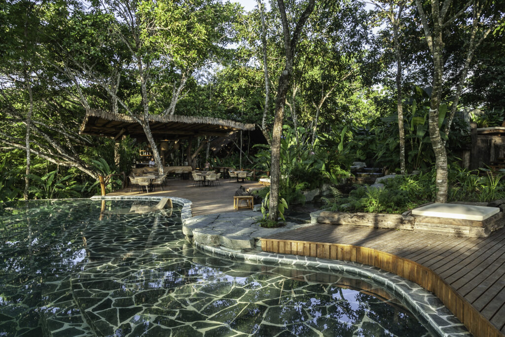 Se quedan cortas las palabras para describir el área de la piscina, que por alguna razón trae a la mente la idea del jardín del Edén o de una versión de lujo de El libro de la selva. Completamente rodeada de vegetación, donde se mimetizan las mullidas y suaves tumbonas y asoleadoras, hay caídas de agua y escaleras secretas hacia sutiles espacios de relajación. Está diseñada de modo que parezca una formación natural de agua, un oasis de frescura que mira al infinito enmarcado, por lo que parece un pincelazo de justas proporciones entre sol y sombra.