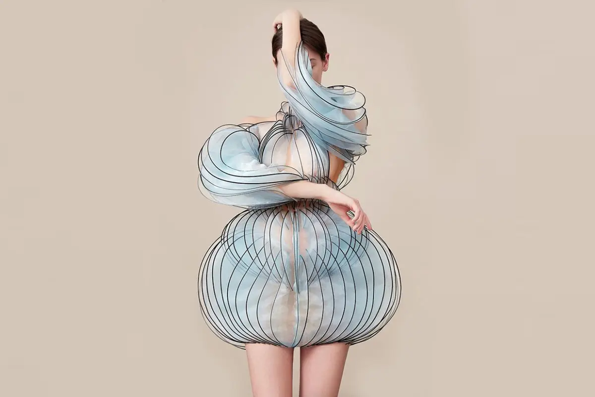 Así es la colección bautizada Hipnosis, 19 vestidos compuestos por múltiples capas inspirados en los patrones de las hojas de un árbol, los glaciares y las ondas que forma una gota en un espejo de agua.