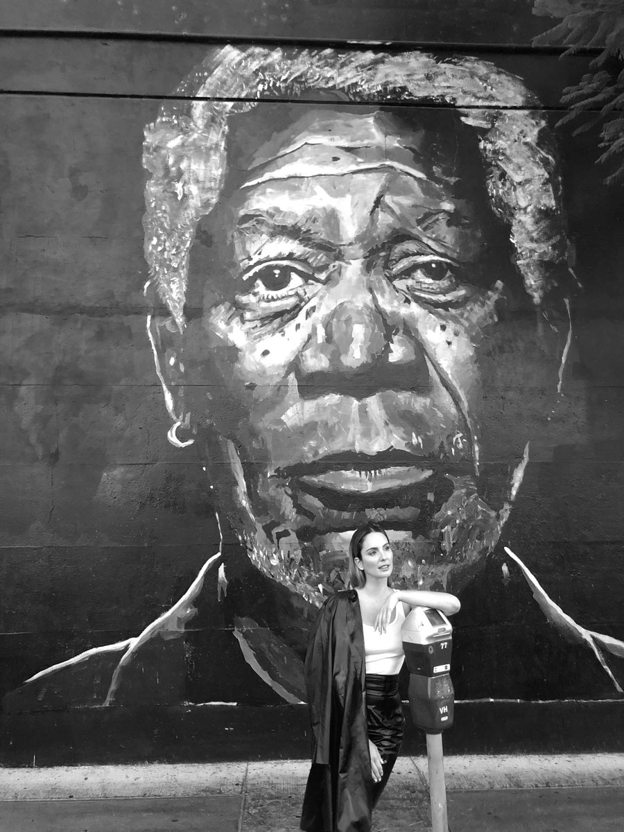 Frente a un grafiti de Morgan Freeman, uno de los actores que más admira
