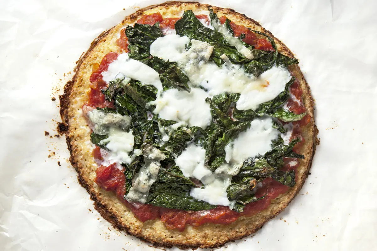 Esta constituye una alternativa deliciosa y saludable a la tradicional pizza. Yo he intentado preparar la base con varios granos sin gluten, como la quinua, el arroz y el maíz, pero esta es mi favorita. La coliflor puede sonar un poco inverosímil, pero se sorprenderá de lo bien que funciona. La textura no es la misma de una pizza tradicional, pero la receta lo compensa en sabor.