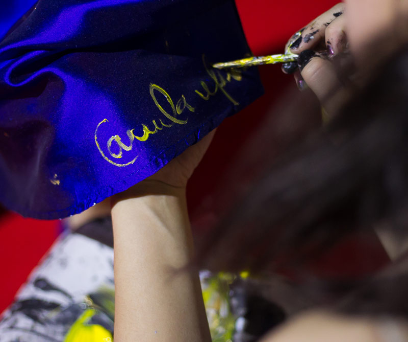 Camila Miranda firmando el vestido de Astrid Amaya en Tailandia. Foto cortesía: Camila Miranda