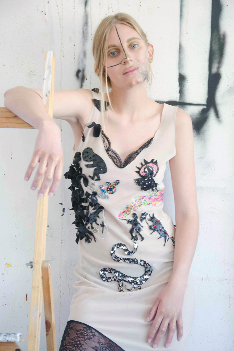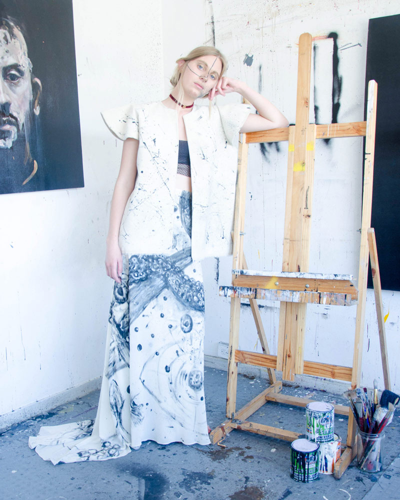 Camila Miranda interviene sus vestidos con pintura, una de las firmas particulares de la colombiana. Foto cortesía: Camila Miranda