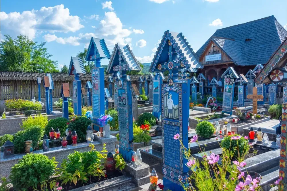 El recorrido se divide en áreas católica, judía y no confesional, y cada una conserva esculturas que resumen la historia estética de la ciudad industrial que fue capital del diseño antes que de la moda. No por nada es considerada el “Olimpo de los cementerios más bonitos de Europa». Cementerio Alegre de Săpânța, Rumanía Foto: trabantos / Shutterstock. Finalmente, en la región de Maramureș, al norte de Rumanía, se encuentra un cementerio que decidió celebrar la vida desde el humor y los colores de los vivos. Săpânța es conocido popularmente como el Cementerio Alegre, un camposanto que nació de la iniciativa del tallador Stan Ioan Pătraș, quien en la década de 1930 comenzó a esculpir cruces de madera azul con retratos y epitafios en verso. Sus lápidas cuentan todo tipo de historias, a veces con ironía, otras con ternura, pero siempre con detalles curiosos como grabados o retratos dibujados que describen cómo vivió la persona que yace debajo. El resultado es un conjunto de más de ochocientas cruces pintadas a mano -generalmente azules- que narran la memoria del pueblo sin solemnidad. Las escenas cotidianas, los animales, las herramientas y los colores vivos transformaron este lugar en una expresión de arte popular reconocida en todo el mundo, así como un atractivo turístico que cada año atrae a nuevos visitantes. También le puede interesar: ¿Ya lo conocía? Este es el pueblo más bonito del mundo, según Forbes