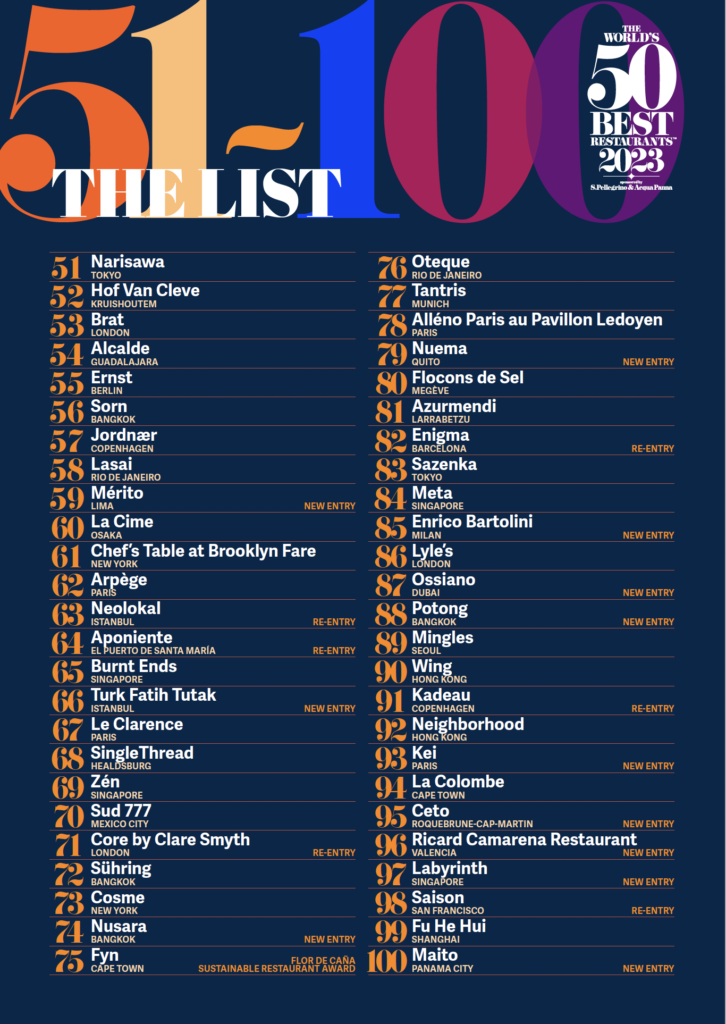 Sudamérica refuerza aún más su posición en la gastronomía global, con el continente contando con nueve restaurantes en general, incluyendo dos nuevas incorporaciones: Kjolle de Pía León (No.28) en Lima y El Chato (No.33) en Bogotá. Asia le sigue con siete restaurantes en la lista, incluyendo Odette de Singapur, nombrado The Best Restaurant in Asia (No.14), junto con las nuevas incorporaciones Le Du (No.15) y Gaggan Anand (No.17) en Bangkok y Sézanne, Tokio (No.37). Dos restaurantes de Dubái ingresan a la lista por primera vez, con Trèsind Studio (No.11) nombrado The Best Restaurant in Middle East & Africa, seguido de Orfali Bros Bistro (No.46).