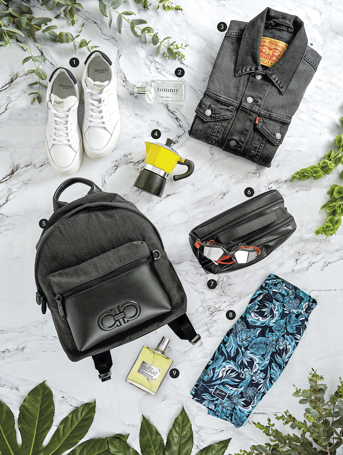 1. Tenis Hackett London, $648.000, en Le Collezioni. 2. Fragancia para hombre Tommy Hilfiger, $99.900, en tiendas Falabella. 3. Chaqueta de jean, Levi’s, $309.000. 4. Cafetera italiana, $34.900, en Casaideas. 5. Morral Firenze, Salvatore Ferragamo, $3.632.000. 6. Cosmetiquera para hombre en cuero, Vélez, $149.900. 7. Gafas Aquapulse Max Mirror 2, Speedo, $156.000. 8. Pantaloneta, Speedo $159.000. 9. Fragancia Cedrat, L’Occitane, $223.000.