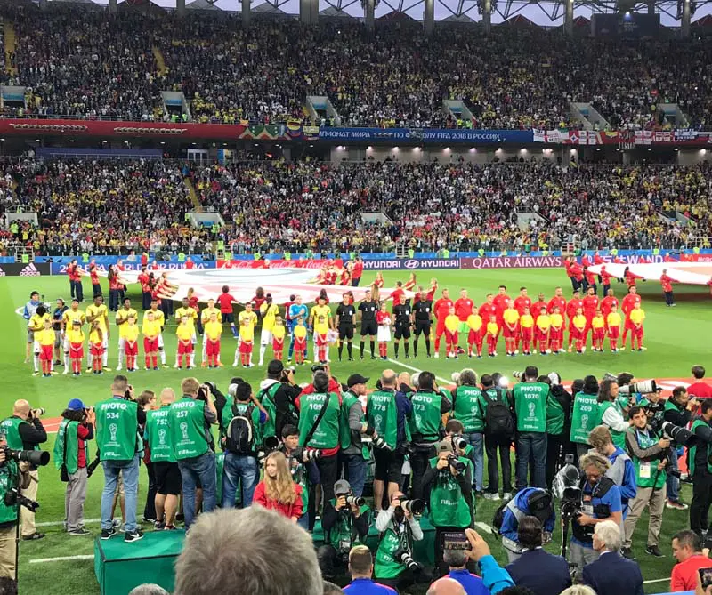 Suenan los himnos. El de Colombia retumbó en todo el estadio (una costumbre en los cuatro juegos del equipo durante el torneo), mientras que el de Inglaterra fue más sobrio. En los juegos que me han tocado entre equipos sudamericanos y europeos siempre ha habido más hinchas de los primeros que de los segundos. Raro teniendo en cuenta la situación geográfica y el nivel de ingresos.