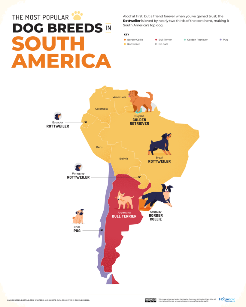 Otras de las razas más populares de Latinoamérica son el Golden Retriever en Guyana; el Bull Terrier en Argentina; el Border Collie en Uruguay; y el Pug en Chile.
