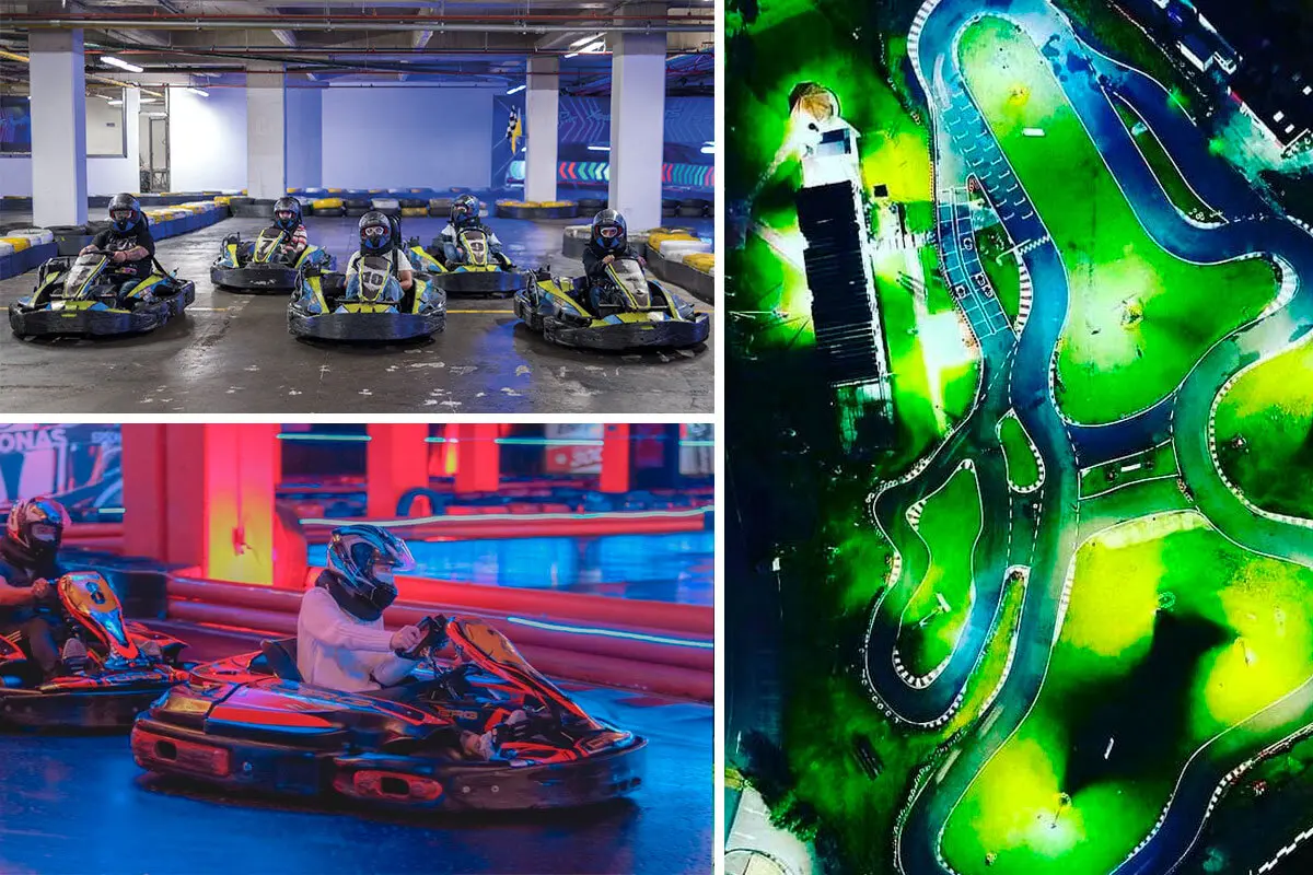 Dentro de estos centros comerciales se encuentran unas pistas con luces de neón, columnas anaranjadas, banderines y los inconfundibles pits que lo harán sentir dentro de una carrera de Fórmula 1.