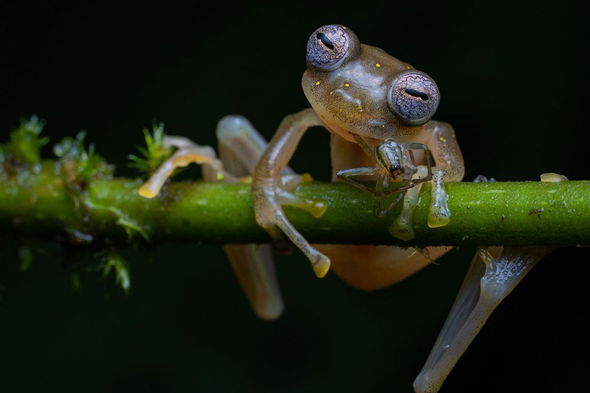 Una rana de vidrio Manduriacu se alimenta de una araña en el noroeste de Ecuador. Esta fotografía, del español Jaime Culebras, ganó en la categoría Comportamiento: anfibios y reptiles. Las ranas de cristal son especies que juegan un papel crucial en el mantenimiento del equilibrio de su ecosistema.