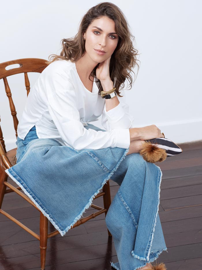 La sesión de fotos fluye sin contratiempo. Posó con la Pink T-shirt y lució algunas de las prendas de Castaway, la más reciente colección de Pink Filosofy, inspirada en los desgastes, los flecos y diferentes formas de intervenir el denim. “Es la primera vez que usamos estampado de rayas. La propuesta tiene algo de inspiración de los años treinta, con pantalones de tiro alto y pierna ancha. Es muy versátil”.
