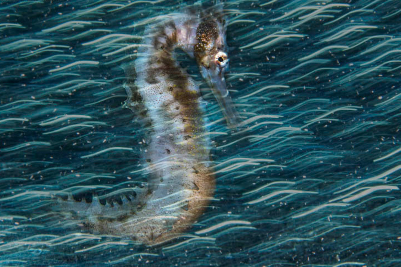 Nur Tucker ganó esta categoría con la foto de un caballito de mar que parece estar atrapado en una corriente marina. Para lograr este efecto utilizó la doble exposición de su cámara. Para Pete Rowlands, miembro del jurado, esta imagen fue una de las ganadoras por “pintar la vida de los que viven allá abajo”.