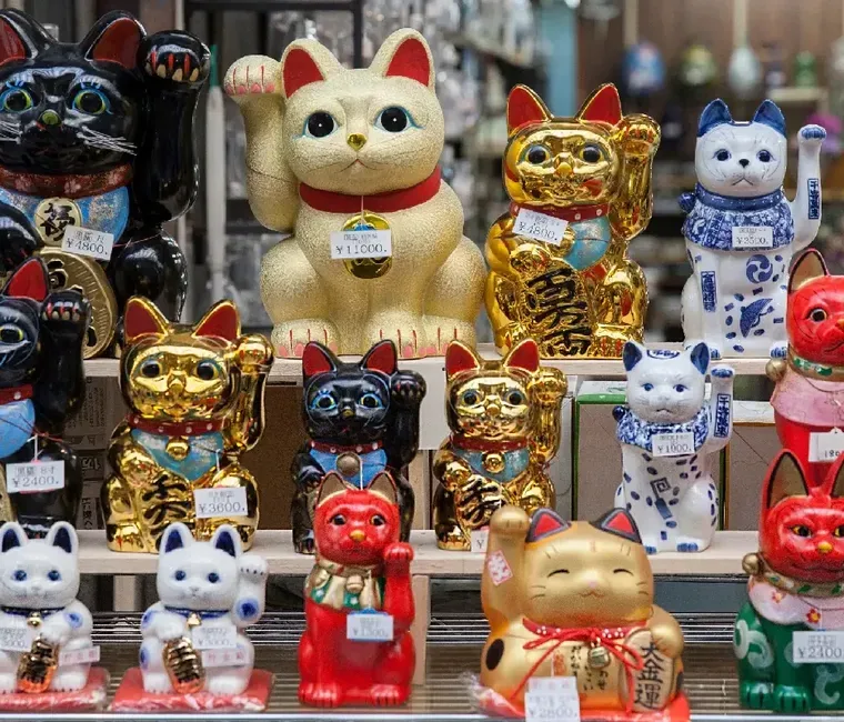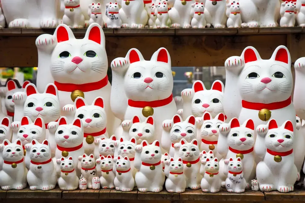 7. Maneki-neko (gato japonés) Foto de Krikkiat / Shutterstock Puede encontrar maneki-nekos en casi cualquier tienda de regalos de Japón, especialmente en Tokio, Osaka y Nagoya. Este gato levantando la pata, símbolo de buena suerte desde el siglo XVII, proviene de una leyenda en la que un gato salvó a un hombre rico al llamarlo con la pata y evitar que un rayo lo alcanzara. Desde entonces, se cree que atrae clientes y prosperidad a cualquier negocio. Dato curioso: la pata izquierda levantada atrae personas; la derecha, dinero. Además, el color también importa: blanco para pureza, negro para protección y dorado para riqueza. También le puede interesar: 10 artículos que requieren autorización para ir en el equipaje durante un vuelo