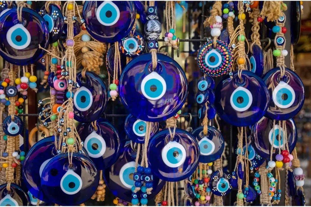 En cualquier mercado tradicional de Turquía, Grecia o Chipre puede conseguir el denominado ojo turco en su versión de vidrio soplado. Suelen venderlo como colgante, llavero, pulsera, adorno para casas y hasta incrustado en cerámica. Su origen se remonta a miles de años, cuando varios pueblos mediterráneos creían que ciertas miradas envidiosas podían atraer mala fortuna. El color azul se asocia con protección porque antiguamente se creía que las personas de ojos azules tenían la mirada más fuerte y peligrosa, así que se usaba ese mismo color para neutralizarla.